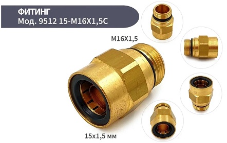 Латунный прямой фитинг «серии 9512» (соединитель быстросъемный с цанговым зажимом, с наружной резьбой М16х1,5 мм, с уплотнительным кольцом, под ключ SW=24) трубки тормозной ПВХ D=15 мм с пневмоаппаратурой тормозной системы.