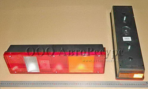 Правый (без подсветки номера) с боковым габаритным фонарем со световозвращателем под лампочки 12/24В подключение: 6-ти штыревая колодка (63 мм)